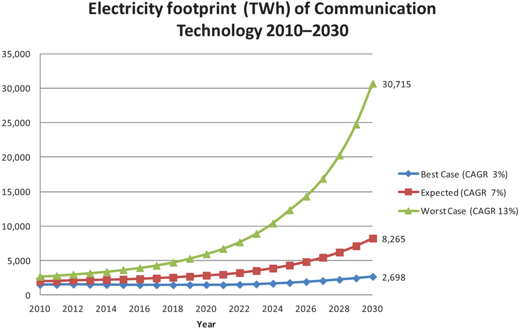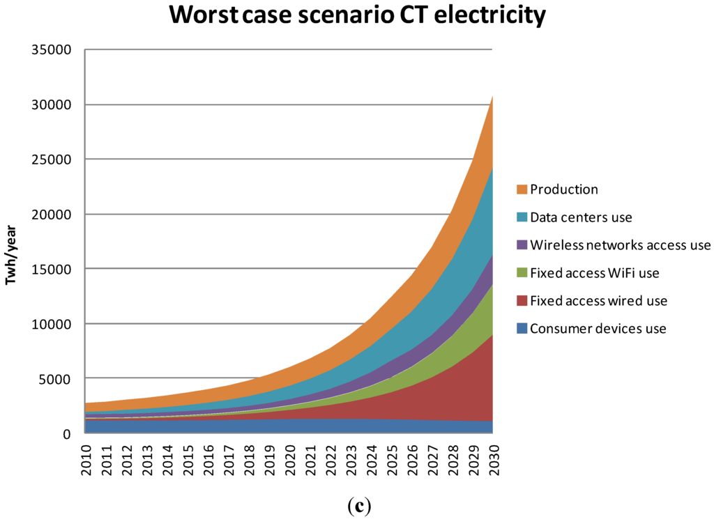 Neither is transport of CT devices included, nor end-of-life treatment, as well as diesel generators used as back-up power in off-grid situations [,,] The present investigation focuses primarily on electricity usage of cradle-to-gate production of a number of CT devices and infrastructure for networks and data centers, and their use-stage electricity. Production is important, as has been shown by previous studies [,,], and the upstream eco-environmental impact can be estimated by applying new standards for life cycle assessment (LCA) from European Telecommunication Standards Institute (ETSI) [,]. We also exclude resource usage, chemical usage, other energy sources apart from electricity as well as generation of electronic and other waste, preventing an overall sustainability evaluation.