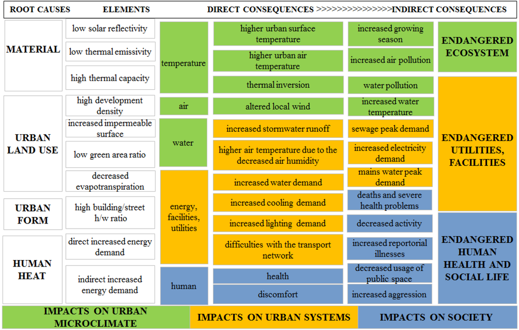 Therefore neither the causes nor the consequences of UHIs can be investigated separately from heatwaves. Heatwaves pose heat stress on cities; while urban heat islands exacerbate conditions in urbanised areas. Therefore, the impacts of UHIs and heatwaves will be handled together in this study as the impacts of UHWs (see Figure 1). The negative consequences can be classified in three main groups, namely the endangered ecosystem, urban system and social life.