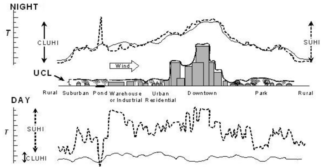 Theoretical magnitude of an urban heat island (UHI) on a city section adopted from Voogt [37].