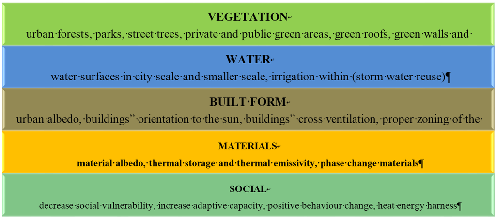 Kleerekoper et al., classified the UHI mitigation opportunities into the following four groups: materials, water, vegetation, and urban form [63]. Anthropogenic heat is missing from among these scopes. Figure 3 summarises the most important mitigation techniques identified from the literature review.