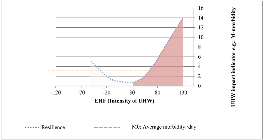 Based on the impact indicators and the intensity of the UHWs a calculation method for precincts heatwave resilience is proposed. Precinct resilience is a measure to the level to which a population within a neighbourhood can ignore heatwaves. The precinct specific resilient value is estimated from the data of several heatwave days. The vulnerability calculation method by Luers et al., is adopted, where wellbeing is changed to the UHW impact indicator and the temperature stressor to the EHF [73], (see Figure 4). The points of UHW impact indicators with the respective EHFs for each day shape the graph of precinct resilience. The shape of the graph characterises the resilience of each precinct.