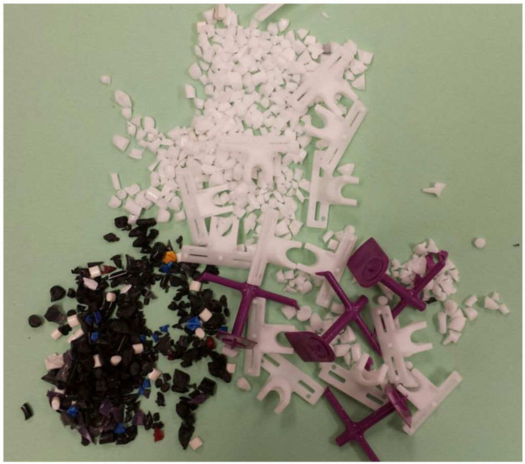 One potential outlet for e-plastics reuse is compression molding. Currently, e-plastics are available in chopped/ground/shredded granular form with great variance in particle size, color, and polymer composition. Figure 1 is representative of different batches of e-plastic resin generated from an e-waste recycling facility in Illinois. Note the presence of colors and the large, irregular objects that did not completely reduce to granules. Compression molding was one of the first industrial methods for plastics, with equipment dating back 100 years [56]. The basic process consists of heating a thermoset resin, under severe pressure, within a closed mold cavity until the resin cures through a chemical reaction where smaller molecules link forming high-molecular-weight polymeric chains. Under the pressure, the resin also liquefies and flows, taking the shape of the mold cavity, and then hardens into the desired part or product. Once sufficiently cooled and strong, the part is removed from the mold and the cycle is complete although the curing reaction continues while cooling to ambient (room) conditions. Thermoplastics are already fully reacted, thus are shaped by first softening the resin through preheating, within the mold or in an external oven, then using pressure to form the part. Instead of a chemical reaction, a simple phase change takes place as the material again hardens upon cooling. Although compression molding is mostly associated with thermosetting resins, PP is a thermoplastic that is easily and routinely molded by this process.