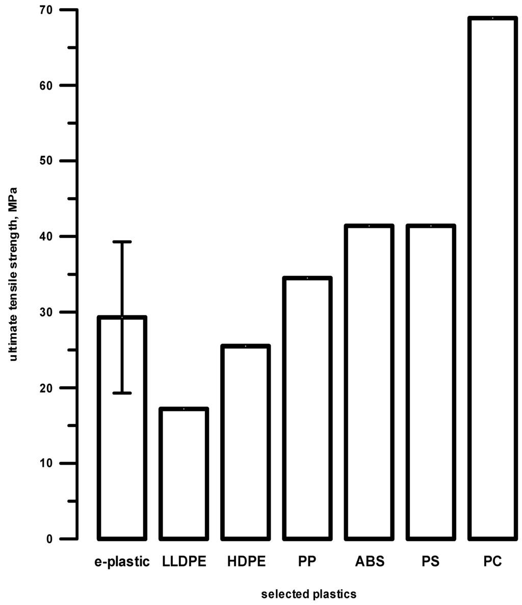 Comparative tensile strength of e-plastics from this study. Reference values for LLDPE, HDPE, PP, ABS, PS,g and PC are from Strong [65].