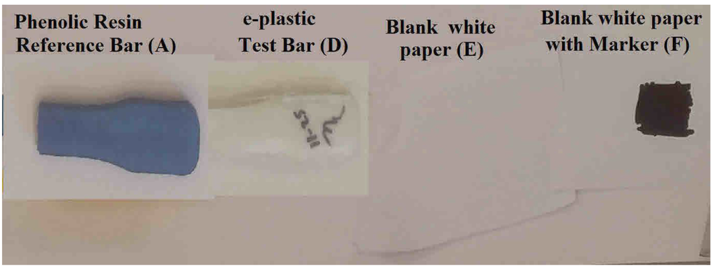Figure 3 shows an example of a compression-molding form using the e-plastic shown in Figure 1. The heterogeneous nature of the e-plastic can clearly be seen. To better understand the processability of this material, 15 samples (in groups of three using a three-cavity aluminum mold) were molded and tensile strength tested, yielding a mean tensile strength of 29.3 ± 10.0 MPa. Figure 4 shows this averaged data along with several other selected plastics. The strength is reasonable, compared to other common, commercial plastics, and proves that such heterogeneous e-plastic can be molded without special or extra processing. Along with the measured mean, there exists a large uncertainty (±10.0 MPa) in the trials. However, it must be pointed out that the 15 samples originated from six different batches of unknown product of unknown polymeric composition. No attempt was made to systematically sort the e-plastic or vary molding parameters in a design-of-experiments (DOE) fashion. At this time, the goal was to demonstrate that with such a variable and heterogeneous resin could be molded at all. Thus, large uncertainty in the measured strengths was expected.