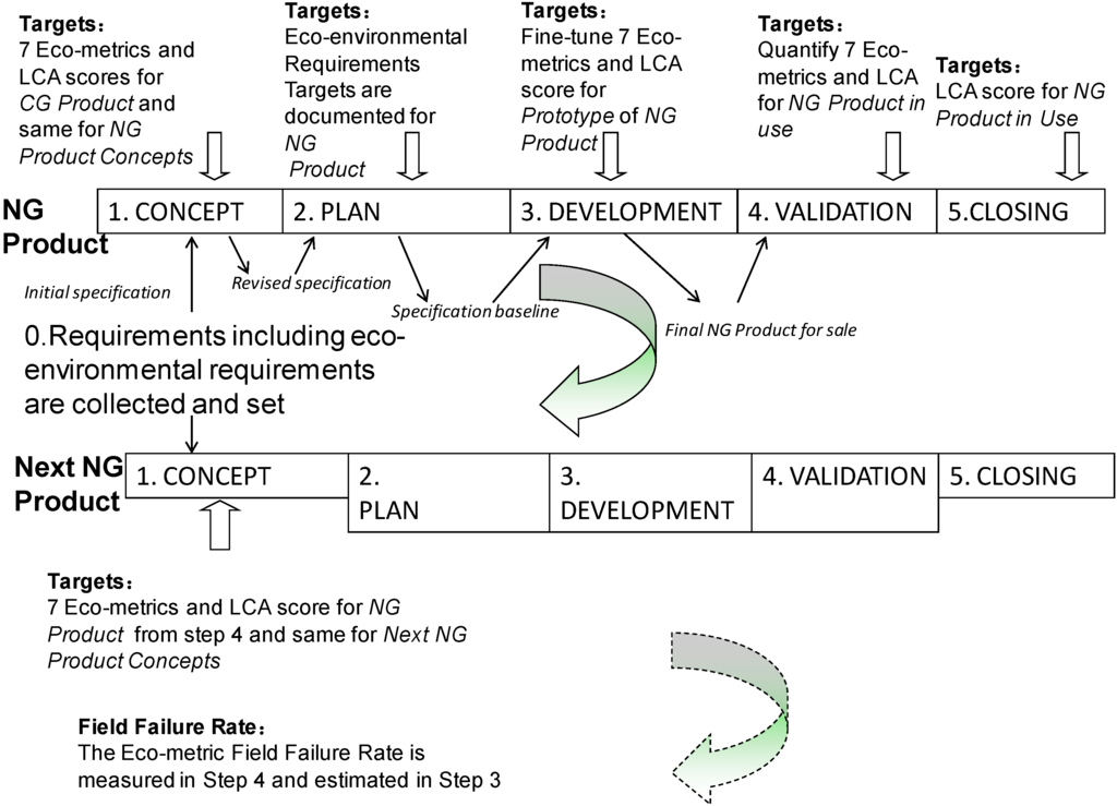 The targets for all eco-metrics are set in step 1 (Concept) and baselined in step 2 (Plan). All eco-metrics are obtained, improved, and fine-tuned in step 3 (Development), however, actual Field Failure Rate (FFR) and “Rethink, Reduce, Recycle, Refurbish, Resale” (5R) values are obtained in step 4 (Validation).