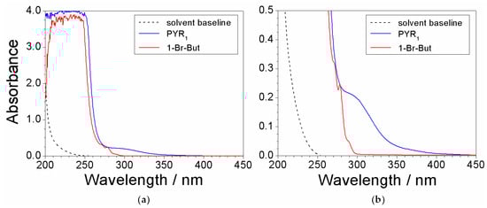 (a) Absorbance vs. wavelength dependence referred to (as received) PYR1 and 1-Br-But previously dissolved in ethanol. (b) Magnification of the 0–0.5 absorbance range of panel (a). The solvent baseline is reported for comparison purpose.