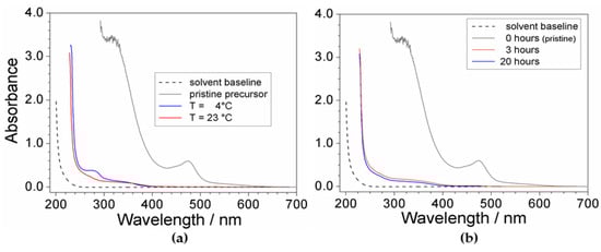 The effect of the temperature and time is reported in Figure 2. It is worth noting the impressive difference with respect to the response given by the pristine precursor (grey trace), highlighting for high efficiency of the purification route. The absorbance vs. wavelength trace obtained for the PYR14Br sample purified at 23 °C (panel a) shows modest, but significant, enhancement of the purity level with respect to that processed at 4 °C which evidenced a more pronounced feature around 280 nm. Conversely, no practical improvement of the precursor quality is observed if the mixing time is increased from 3 to 20 h (panel b). On the basis of these results, the purification routes were carried out above 20 °C, whereas the mixing time was limited to 3 h.