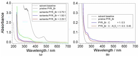 Absorbance vs. wavelength dependence of PYR14Br samples (in ethanol) obtained through purification routes carried out at different (a) (C + Al2O3): PYR14Br weight ratios and (b) Al2O3 contents. The C: Al2O3 weight ratio is fixed equal to 2:3. The trace referred to pristine PYR14Br and solvent baseline is reported for comparison purposes.