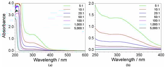 UV-VIS measurements were performed (at room temperature) on the precursor solutions listed in Table 1. The results (reported in Figure 4) reveal, apart the features around 200 nm due to PYR14Br and the PYR1 excess, significant profiles within the 260–450 nm wavelength range, which became progressively weaker with the increase of the dilution ratio. These features, as observed in Figure 1 for the UV-VIS measurements run on reagents, are to be assigned to impurities. In addition, as better evidenced in the magnification of the 250–400 nm range depicted in panel (b), evident spectrophotometric signals are observed even at high dilution ratios (i.e., very low content of impurities). Therefore, the absorbance due to the impurities in the precursor aqueous phase is seen (as expected) to depend on their concentration and, consequently, on the precursor purity level.