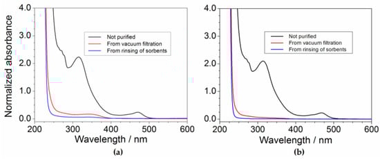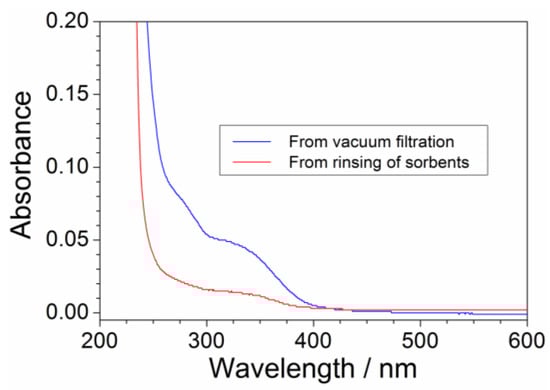 Absorbance vs. wavelength dependence for the aqueous PYR14Br phase collected, respectively, after vacuum filtration and rinsing step of sorbents (C: Al2O3 weight ratio = 2:3; (C + Al2O3): PYR14Br weight ratio = 1.5:1).