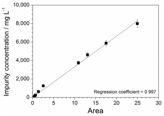 The absorbance vs. wavelength response, obtained from UV-Vis measurements carried out on aqueous precursor solutions (Figure 4), is characterized by various features, which are ascribable to the different impurities within the PYR14Br samples (Figure 2 and Figure 3). Particularly, the area value (error bar equal to 5%) comprised between each UV-VIS plot, recorded in the 260–600 nm range of Figure 4, and the X axis (i.e., reporting the wavelength number) is directly proportional to the overall amount of impurities contained in the volume of precursor sample subjected to spectrophotometric measurements. As identical volumes of each precursor sample were analyzed, we can assume direct proportionality between the overall content and the concentration of impurity. The latter, referred to the aqueous PYR14Br solutions reported in Table 1, was plotted as a function of the area delimited by the absorbance curves of Figure 4 towards the X axis in the 260–600 nm range. The results, reported in Figure 7, show an almost linear concentration vs. area relationship up to an impurity content of 60 mg L−1 in agreement with the Equation (2) (regression coefficient = 0.997):