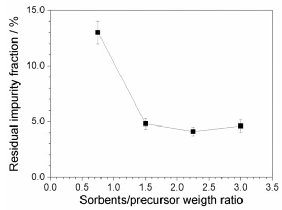 Figure 9 plots the residual fraction of the impurities, normalized with respect to the initial content, as a function of the (C + Al2O3): PYR14Br weight ratio. A relevant and progressive reduction of the impurity level with the increase of the sorbent amount is seen, i.e., from about 13 (above 2000 ppm) to less than 5% (below 800 ppm) with respect to the initial concentration of impurities is detected moving from a (C + Al2O3): PYR14Br weight ratio of 0.75:1 to 1.5:1. A further increase of the sorbent amount does not lead to any practical improvement in terms of the purity level of the precursor. We can likely hypothesize that, when the impurity content is very low, the precursor is preferentially adsorbed onto the sorbent surface (with respect to impurity), this hindering the adsorption of further impurities even in the presence of larger sorbent amounts. It should be noted that the possibility to use lower amounts of sorbents leads to reduction of the time/cost of the purification route and softer rinsing/recycling steps.