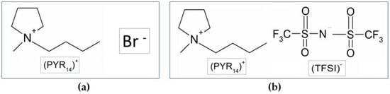 1H NMR measurements (Figure S3 in Supplementary Materials), performed on PYR14TFSI, clearly indicate that the (PYR14)+ cation was correctly synthesized. The features observed at 2.5 and 3.0 ppm are ascribable, respectively, to deuterated dimethylsulfuroxide, DMSO, (used as the solvent) and moisture absorbed from external during the NMR measurements (performed in uncontrolled environment).
