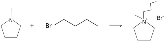 Synthesis reaction of the PYR14Br precursor from N-methylpyrrolidine and 1-bromobutane.