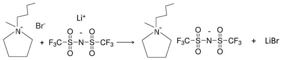Synthesis reaction (metathesis) of the PYR14TFSI ionic liquid from the PYR14Br precursor and the LiTFSI lithium salt.