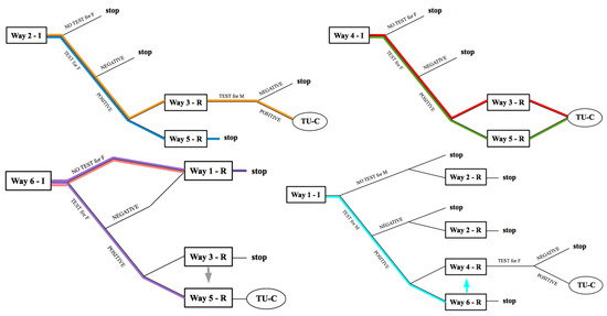 In [2] the notion of Way has been introduced as the initial path that marks the start of a TU-C. Such early phase has a key role in the further dynamic development of TU-C itself. Depending on who, between the two potential partners, takes the initiative, and on the area from which the interaction starts, it is possible to single out six basic cases, three for each sex. The summing up diagram, that helps to associate the Ways’ numeration to the various cases (see Figure 10), visually synthetizes the relationships between each Way and the AA vs. RA of M vs. F from which TU-C takes off. Specifically, TU-C starts from AAs are depicted in red and starts from RA in blue for each hemicycle, male and female. It turns out, then, that to each AA corresponds only one possible Way (1–2), whereas from each RA two different Ways can depart (3–5 vs. 4–6), depending on the direction of movement of TU-C—clockwise or anti-clockwise.