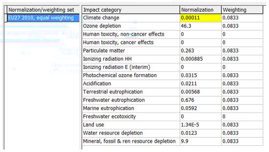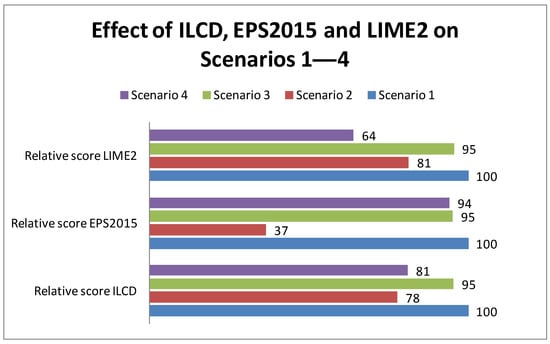 In fact, the non-equal weights for each impact category, shown in the weighting column in Figure 1, are currently pending a decision to be based on the judgment of a life cycle impact assessment expert panel. In an attempt to expand the sensitivity analysis and improve the trend finding, two other weighting methods, EPS2015 [] and the Life Cycle Impact Assessment Method based on Endpoint modeling (LIME2) [], are also applied to S1–S4.