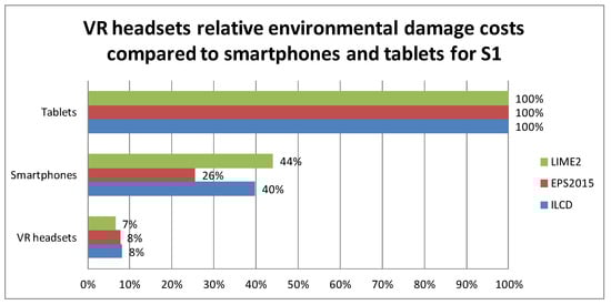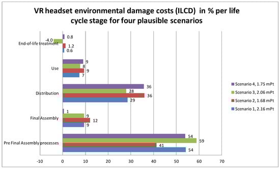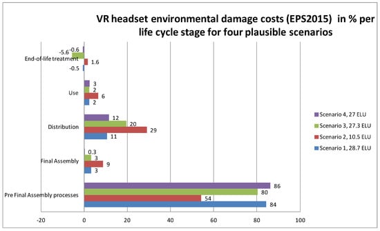 For S1 in Figure 2, it is surprising that the distribution of the VR headset (≈29% of the total score) is more important than the use stage (≈7%). The share of the production of the electronics at ≈36% is rather high, as expected for consumer electronics [,,,], and all other parts such as plastic and screws are ≈17%. The ICs (including 13% gold production and 12.5% Wafer Processing (WP) and final IC assembly) are 26% of the total score, which make them important but not dominant as hypothesized. Primary gold production is 18% of the total score. In comparable ILCD scores for smartphones and tablets, the electronics (especially ICs and screens) are ≈90% and distribution is ≈2%.