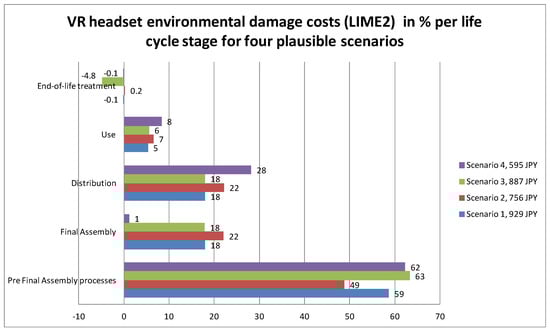 Life cycle assessments (LCA) of consumer electronic devices are common []. Most LCAs report Global Warming Potential indicator scores and other mid-point indicators, while weighted single score results are rare. Subramanian and Yung [] summarized 134 LCA studies and observed that the final transport distribution is generally not a dominant life cycle stage, but rather the use and production stages. In many cases, differences in LCA reports of consumer electronics can be explained by the differences in assumptions []. LCA studies of smartphones are widespread, so the major hot spots for Global Warming Potential Indicators (GWPI) are well known as integrated circuit (IC) production, screen production, use, and distribution. Andrae [] used the Life Cycle Impact Assessment Method based on Endpoint modeling (LIME1) [,] to estimate the environmental damage cost of producing one smartphone from 2012, ≈1800 Japanese Yen (JPY). However, more recent devices such as VR headsets are not yet covered by the academic literature. Furthermore, to the authors’ knowledge, neither Environmental Priority Strategies (EPS2015) [] nor LIME2 [] results for consumer electronics device have yet been published.