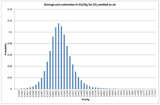 Moreover, the absolute uncertainty ranges of end-point weighed scores are likely very large. Based on the appendices of EPS2015 [], the uncertainty for the environmental cost (0.13 Environmental Load Unit (ELU) ≈ Euro) of emitting 1 kg CO2 to air could be around 169% (coefficient of variance), i.e., −0.255 to 0.6 ELU/kg CO2 in a 95% confidence interval, (mean value = 0.13 ELU/kg CO2; standard deviation = 0.219 ELU/kg CO2). The probability density function for this interval is shown graphically in Figure 7.