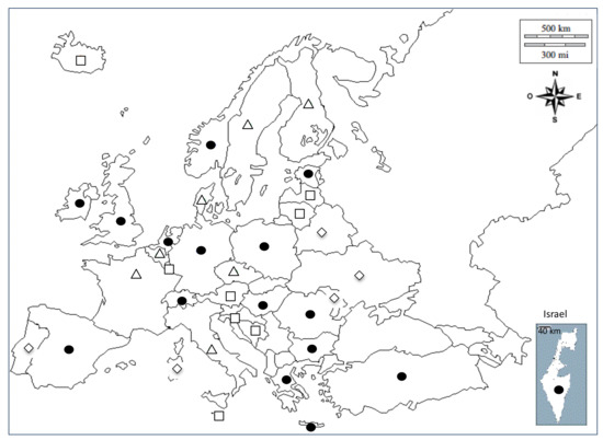 We highlight the, (i) commitments to formalized ERIs in National roadmaps (open triangle), (ii) presence of a National roadmap indicating commitment to one of more ERI (filled circle), (iii) absence of a National roadmap and/or piecemeal involvement in ERI (open square), and (iv) none of the above (open rhombus). This is a result of all 22 national roadmaps (www.esfri.eu/national-roadmaps).