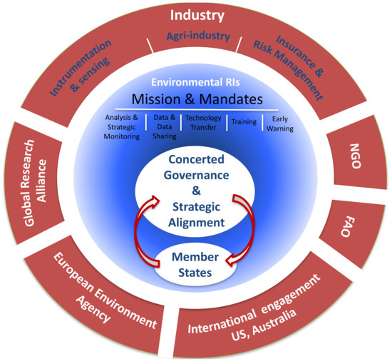 Many governments have mandates and policies that ERI data can contribute towards. For example, in the EU, the Sustainable Development Goals (SDGs) are not legally binding, but member states are expected to take the lead and set up national frameworks including ESFRI RIs to achieve the respective 17 SDGs. Countries have primary responsibility for monitoring and reviewing progress in this area, which will require the timely collection of quality and easily accessible data that can be done only through a coordinated and integrated ERIs. Data from ERIs are designed to directly contribute to regional monitoring of ecosystem sustainability in order to meet the SDGs. With respect to European environmental policies, climate change is already having an impact on public health, food security, security of water supply, migration, peace and security [28,29]. ERIs are contributing significantly to meeting these political visions and policies. This also leads to more cost-efficient use of the support provided by the Member States’ and Associated States’ to the ERIs.