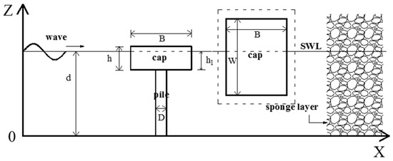 The sketch of wave and pile-cap system interaction model is illustrated in Figure 1, where W = 14 m is the length of the cap, B = 7.7 m is width of the cap, h = 3 m is the height of the cap, D is the diameter of the pile, h1 is the submerged depth of the cap, d is the water depth of the numerical wave tank and submerged coefficient Cs = h1/h, a positive value of Cs implies that the cap are submerged in the water and a negative value of Cs implies that the caps are above the free water surface.