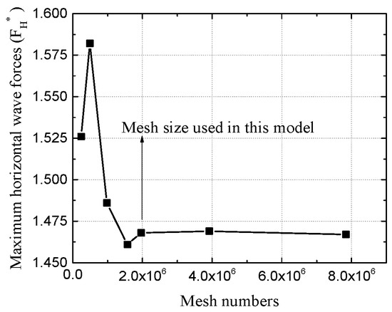 Different size of meshes were tested to ensure the sensitivity and accuracy of the mesh solutions in simulating the wave and pile-cap system interaction problem. A set of mesh sizes was conducted by improving the mesh system until no significant changes in the simulation results. Figure 2 illustrates the maximum horizontal wave forces (FH* = FHmax/DρgH) on piles versus different mesh sizes (express by total numbers of mesh), in which FH* is the relative horizontal wave force and FHmax is the real maximum horizontal wave force. During this test, the water depth d = 30 m, wave height H = 2 m, wave period T = 6 s, and the diameter of the pile D = 1.8 m. The time-step in this manuscript is 0.01 s. As shown in Figure 2, the mesh sizes adopted in this study are feasible enough to satisfy the computational accuracy.