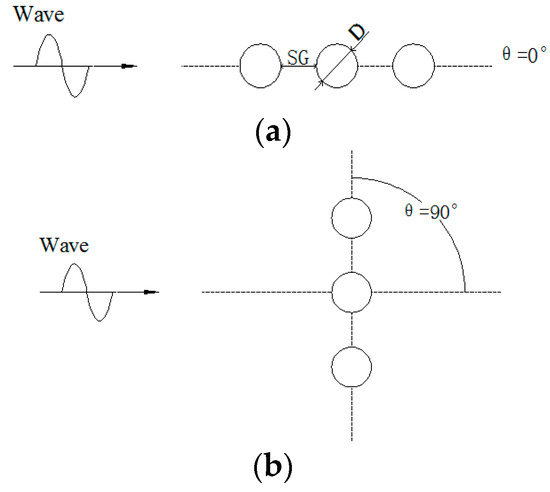 The validation is to compare the model with laboratory experimental data [12] for the case without the cap under wave forces. In the experiment, the force and moment transducers were used to measure the wave force and wave moment on the measured pile, which is 5 cm in diameter. The line force was measured by a ring transducer at a certain elevation of water (z/h = 0.78). An acoustic Doppler velocimeter was used to capture the wave-induced horizontal flow velocity at this certain elevation. In this paper, two kinds of pile group arrangements, including side-by-side and tandem, were selected to make a comparison and the sketch of the two kinds of arrangements is illustrated in Figure 3. The KC number KC = umaxT/D, where umax is the maximum horizontal wave-induced flow velocity at a certain elevation of water (z/h = 0.78), T is the wave period, and D is the diameter of the pile. The pile group effect was evaluated by the pile-group effect coefficient KG = fGroup/fSingle, where fGroup are the line forces on the pile with a group of piles measured by the ring transducer, and the fSingle is the wave force on a single pile under the same wave conditions. The detailed explanation of the laboratory experiment can be seen in Bonakdar et al. [12].