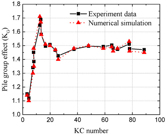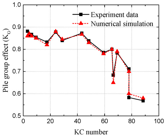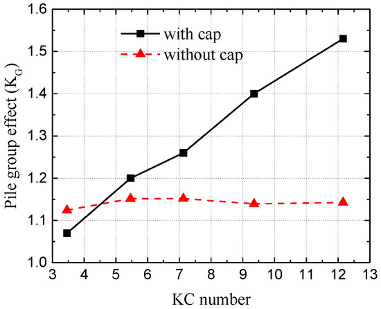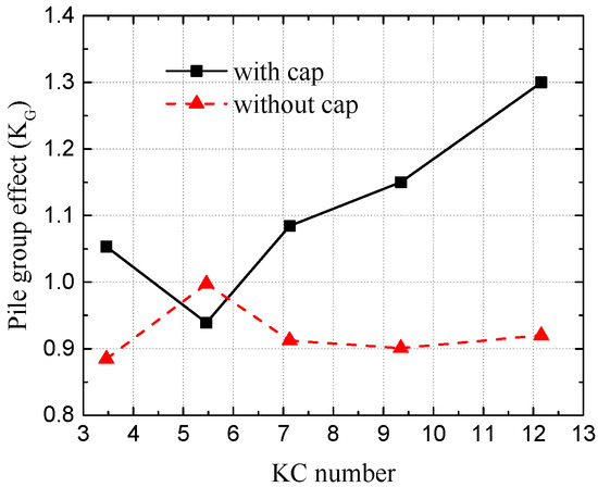 Variations of the pile group effect versus various KC numbers with the side-by-side arrangement of the pile group.