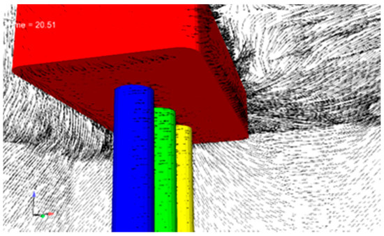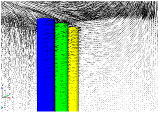 Figure 6 and Figure 7 illustrate the distributions of the flow velocity field around the pile without the cap and the connection part between the cap and pile, respectively. Here, wave height H = 2 m, wave period T = 6 s, and the submerged coefficient Cs = 1 and SG/D = 1.