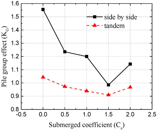 In this section, five types of submerged coefficients of the cap from 0 to 2, with an interval of 0.5, were selected to evaluate the variations of the pile group effect with the side-by-side arrangement. Here, wave height H = 3 m, wave period T = 8 s, water depth d = 30 m, and SG/D = 1. Figure 10 illustrates the variations of the pile group effect versus various submerged coefficients of the cap with different arrangements of the pile group.