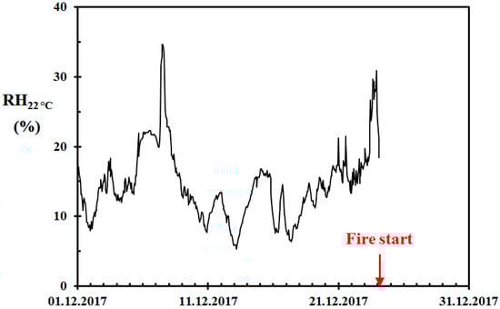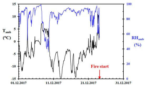 During December 2017, Norway experienced two fatal fires in wooden structures for vulnerable people, i.e., the “Bulls minde” fire in Horten, 16 December (one fatality and loss of ten flats) and the “Skinnarberga senior home and care center” fire at Kongsberg, 24 December (one fatality and loss of 24 flats). The first fire was reported at 16:16, while the last fire was reported at 03:00, i.e., during the night shift. Both fires received national attention due to the intense and very fast fire development, the narrow escape for low mobility inhabitants, and the loss of one life in each fire. Both fires had several signs of typical cold-climate fires. For the first fire, there was no meteorological station recording ambient relative humidity in the vicinity. For the second fire, the closest meteorological station was located only 4.5 km from the Skinnarberga senior home and care center. The ambient temperature and relative humidity for this meteorological station are shown in Figure 1. Theoretically estimated indoor relative humidity, based on the values in Figure 1 and the calculation procedure explained in [], is shown in Figure 2. The buffering effect of the wooden materials and the moisture gain from indoor activities are not taken into consideration. It should be noted that in these types of flats inhabited by single seniors, a moisture gain well below 1 g/m3 would be expected. Comparing this to the equilibrium water content of 20 g/m3 at 22.5 °C, a less than 5% increase in the indoor relative humidity (RH) due to human activities may be expected.