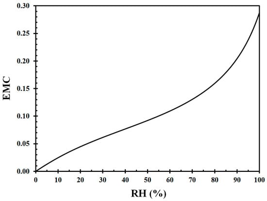 Live plants may contain substantial amounts of water, i.e., >100% relative to being oven-dried for 48 h at 105 °C []. Dead wood, when not soaked, contains less than 30% by weight water to the dry weight basis. It is the possibility of forming hydrogen bonds to water that makes wood and other cellulosic products hygroscopic. This water may be supplied from or exported to external sources, such as liquid water or dry or humid air. The wood’s Equilibrium Moisture Content (EMC) is a function of the air’s Relative Humidity (RH). The EMC for pine wood as a function of RH is shown in Figure 3. Due to the complexity of the wood structure, also on a molecular level, hysteresis effects are observed []. In principle, however, wood that is drier or more moist than the EMC corresponding to the current relative humidity will approach this EMC value by absorbing or releasing water vapor. This is, however, a very slow process, while the normal drying process is faster and governed by diffusion processes.