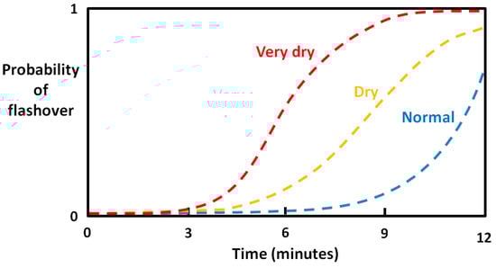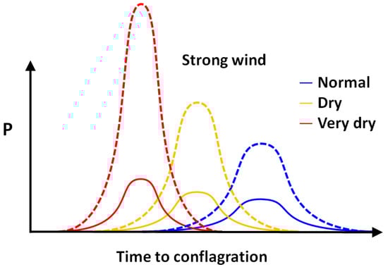 The research could, e.g., involve modelling representative structures of low, medium, and high indoor moisture supply. The values for such groupings may be found in the field of building research, e.g., []. Increased air change rates in windy conditions could also be considered in the models, as well as light, medium, and heavy wood loadings (wall panels, floors, and furniture). In the simplest form, the fuel moisture content in the involved structures could be presented as the probability of flashover as a function of time for a given started fire, as suggested in Figure 4. For the sake of simplicity, a normal distribution is assumed. One may then consider Figure 4 as the dry wood contribution to the single wooden structure risk rating.