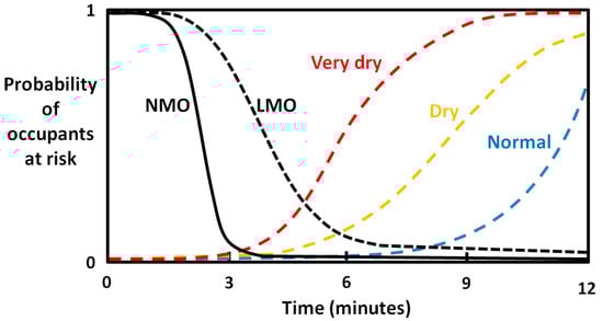 A fire in a single home dried to condition “very dry” may be taken as an example, and for simplicity, flashover may be taken as a non-tenability condition. If the inhabitants have normal mobility and are warned by fast-response smoke detectors, they will generally be able to evacuate their home before untenable conditions. This is indicated in Figure 5 (solid black line), i.e., the probability of the inhabitants being able to evacuate is high. In the same figure, it is indicated that inhabitants with lower mobility are generally more at risk. It is also seen in Figure 5 that, especially when the fire develops fast in very dry conditions, these groups of vulnerable people are significantly more at risk.