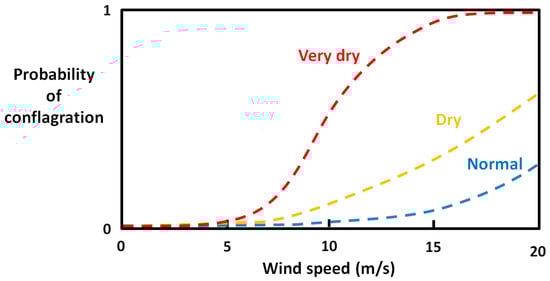 In a study regarding the likelihood of wildfires, Mhawej et al. [] listed 28 factors categorized as climatic, topographic, in situ, historical, and anthropogenic. The present study is more confined, since it considers structural wooden structures in very dry condition fires compared to normal conditions. This allows us to focus on the most important issues, i.e., focus on drying for individual structures and drying and wind conditions for conflagrations.
