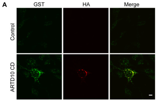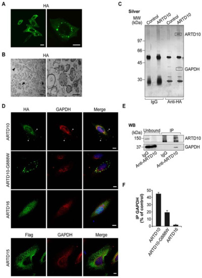 Semi-confluent HL60 cells (1 mL/10 × 104 cells) were centrifuged for 5 min at 200× g and incubated with RIPA buffer, for 30 min at 4 °C, with constant rotation. For immunoprecipitation, semi-confluent CHO and HeLa cells were transiently transfected with the empty vector or with the indicated HA-ARTD enzymes, and then incubated with RIPA buffer (1 mL/100 mm Petri dish). The cells were broken by passage (14 times) through a 25-gauge syringe needle. The lysates were collected and centrifuged at 12,000× g for 45 min at 4 °C. The supernatants were incubated with 2 μg anti-ARTD10 or anti-GAPDH antibodies (co-immunoprecipitation; Figure 1E), or with 2 μg anti-HA antibody (immunoprecipitation; Figure 1C) overnight at 4 °C, with constant shaking. The day after, the samples were incubated with 40 μg of a 50% slurry of protein-A Sepharose resin (CL4B; Amersham Pharmacia Biotech, GE Healthcare, Little Chalfont, UK), for 1 h at 4 °C, with constant rotation (200 rpm). The resin was washed three times with RIPA buffer, and then boiled in loading buffer. The samples were either analysed by silver staining, and the immunoprecipitated bands were identified by MALDI-TOF mass spectrometry (immunoprecipitation; Figure 1C) or resolved by Western blotting using antibodies raised against GAPDH or the HA tag. The GST pull-down was performed as previously reported [13,40]. Briefly, two mg of total lysates for each sample were solubilised with 1.5 mL RIPA buffer and incubated with a glutathione-Sepharose resin for 2 h at 4 °C, for the preclearing step. The supernatant underwent two-steps of pull-down, the first with 50 μg macro domain (m)Af1521/G42E mutant, covalently cross-linked to a resin, which does not recognise ADP-ribosylated proteins, for 4–5 h at 4 °C. The supernatant from the first pull-down was then incubated overnight at 4 °C with 50 μg GST-tagged mAf1521 wt. The beads were collected by centrifugation at 700× g for 5 min, and washed three times with 1 mL lysis buffer. Protein that remained bound to the resin was eluted at 100 °C for 5 min with sample buffer, and then subjected to SDS-PAGE. The eluted proteins analysed by gels underwent silver staining, and the bands of interest were cut, trypsinised and analysed by MALDI-TOF mass spectrometry.