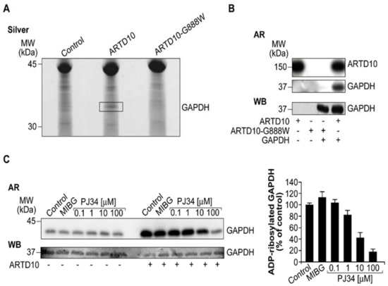 The ART activity was measured by following the incorporation of radioactive ADP-ribose into membrane components, as described previously [14]. When the ADP-ribosylation assay was performed with purified proteins, 500 ng or 1 µg purified recombinant ARTD10 and GAPDH proteins were incubated in 50 µL ADP-ribosylation buffer (50 mM Potassium phosphate buffer (PFB), pH 7.4, 5 mM MgCl2, 4 mM dithiothreitol, 30 µM β-NAD+ and 4.5 µCi [32P]-NAD+) for 60 min at 37 °C). Samples were separated by 10% SDS-PAGE and transferred to nitrocellulose filters (Perkin Elmer, Waltham, MA, USA). The filters were exposed to Kodak X-Omat film, using an intensifying screen, and quantified with an InstantImager (Packard Instrument Co., Thermo Fisher Scientific, Hampton, VA, USA). N-(6-Oxo-5,6-dihydro-phenanthridin-2-yl)-N,N-dimethylacetamide hydrochloride (PJ34) and meta-iodobenzylguanidine (MIBG) were purchased from Sigma Aldrich. The GAPDH activity was measured by evaluating the conversion of NAD+ to NADH using the KDalert GAPDH assay kit (Ambion, Applied Biosystem, Foster City, CA, USA) in cells lysates prepared from either untransfected cells or cells transfected with ARTD10 wt or with catalytically inactive ARTD10-G888W.