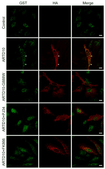 As we showed that ARTD10 and GAPDH co-localise in the cytoplasmic cell bodies (Figure 1D), and that GAPDH is ADP-ribosylated by ARTD10 (Figure 2), we used the cognitive binding module mAf1521 to visualise the intracellular localisation of ADP-ribosylated proteins in HeLa cells by immunofluorescence microscopy [45] (Figure 3). The HeLa cells were either not transfected (mock; Figure 3, control) or were transfected with the HA-ARTD10 wt (Figure 3, ARTD10) or with its inactive mutant HA-ARTD10-G888W (Figure 3, ARTD10-G888W), incubated with GST-mAf1521 and then analysed by immunofluorescence microscopy, using an anti-HA antibody to detect the overexpressed enzymes, and an anti-GST antibody to visualise ADP-ribosylation. The immunofluorescence images showed clear cytosolic cell body staining for ARTD10 (Figure 3, ARTD10) and for ARTD10-G888W (Figure 3, ARTD10-G888W). Of note, the staining with GST-mAf1521 revealed ARTD10-containing cell bodies stained in cells transfected with enzymatically active ARTD10; in contrast, in the cells transfected with the inactive protein, ARTD10-G888W, there was no cell-body staining with GST-mAf1521, which instead showed a punctate, nuclear staining, as in the control cells. The mutated GST-mAf1521/G42E that cannot bind ADP-ribosylated proteins showed no staining in the control and transfected cells (not shown), as expected [45]. This staining with GST-mAf1521 in cells transfected with enzymatically active ARTD10 is in line with ADP-ribosylation events occurring at the level of the ARTD10-containing cell bodies, although it is not possible to discriminate whether the staining is associated with either ARTD10 or GAPDH, or both. Furthermore, the prominent GST-mAf1521-dependent change in the staining of cells seen upon transfection with the active ARTD10 enzyme was completely abolished when the cells were treated with either PJ34 (50 μM; Figure 3, ARTD10 + PJ34), which inhibits ARTD10-dependent ADP-ribosylation of GAPDH (Figure 2C), or with FK866 (10 μM; Figure 3, ARTD10 + FK866), which inhibits Nampt (a key enzyme involved in NAD+ biosynthesis) and thus reduces the NAD+ levels in cells [45,46]. Thus, these data in addition to confirming that ADP-ribosylation events occur in cell bodies containing the over-expressed ARTD10 [46] also demonstrate that the inhibition of the ART activity of ARTD10 by PJ34 and the decreased levels of NAD+ (the cofactor of the ADP-ribosylation reaction) by FK866 resulted in the disappearance of ADP-ribosylated proteins from the cytoplasmic bodies. These last results are in line with the concept that the catalytic activity of ARTD10 is not strictly required for the formation of these cell bodies; indeed, other domains of the ARTD10 protein have been demonstrated to be required for formation of cell bodies [46], although ADP-ribosylation/de-ribosylation events can occur within these cell bodies and might have a role in the recruitment of ARTD10 targets.