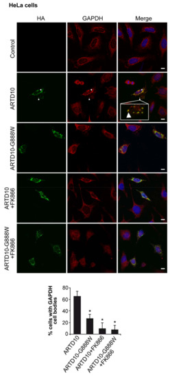 This indication was further confirmed in cells that overexpressed the catalytically active ARTD10 (HA-ARTD10 wt) and were treated with FK866, which inhibited the ADP-ribosylation reaction. In the presence of FK866, only around 9% of the cells bodies formed were positive for both ARTD10 and GAPDH, in both HeLa and U2OS cells. Similar results were obtained when these cells were transfected with PJ34 (not shown).