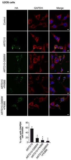 Quantification of the percentage of cell bodies containing GAPDH indicated that 66% ± 9% and 57% ± 7% of all of the cell bodies formed in HeLa (Figure 4) and U2OS (Figure 5) cells transfected with HA-ARTD10 wt, respectively, were positive for both ARTD10 and GAPDH. The percentage of cell bodies that contained GAPDH decreased to 25% ± 7% and 17% ± 5% in HeLa (Figure 4) and U2OS (Figure 5) cells transfected with HA-ARTD10-G888W, respectively. These data thus indicate that the catalytic activity of ARTD10 is necessary to recruit GAPDH to these cell bodies.