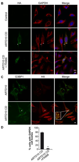 ARTD10/PARP10-CD localises in stress granules. Representative immunofluorescence microscopy of HeLa cells. (A,B) Cells were mock transfected (Control), or were transiently transfected with HA-ARTD10-CD without (A) and with (B) treatment with FK866 (as indicated). (A) The cells were incubated with mAf1521 and stained with anti-GST (GST; green) and anti-HA (HA; red) antibodies (as indicated); (B) The cells were stained with anti-HA (HA; green) and anti-GAPDH (GAPDH; red) antibodies; (C) Cells were transiently transfected with GFP-G3BP1 and with HA-ARTD10 or HA-ARTD10 CD (as indicated). The cells were then stained with anti-HA (HA; red) antibody. Scale bars, 10 μm. Data are representative of three independent experiments. The inset shows the localization of ARTD10 CD with GFP-G3BP1; (D) Quantification of % ARTD10-CD cytoplasmic cell bodies positive for GAPDH is shown, with the data expressed as means ± SD of three independent experiments. *, p < 0.001.
