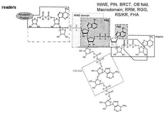 The complex of modification enzymes, in addition to writers and erasers, includes also the readers and proteins that bind to MAR or to PAR segments, interacting with specific domains [] (Figure 1). The MAR and PAR regions are recognized (read) by protein motifs such as Macrodomains, PAR Binding Motif (PBM), PAR Zinc finger (PBZ) domains (binding to ADP ribose-ADP ribose junctions), WWE domains (tryptophan/glutamate) and Forkhead-associated (FHA) domain (binding to iso ADP ribose), oligonucleotide binding fold (OB fold), RNA recognition Motif (RRM), the serine arginine repeats and lysine arginine repeats (SR/KR) motives in RNA binding proteins, PIN (PilT N-terminal) domain in PIN and Exo1 nucleases, and BRCA1 C-Terminal region (BRCT) in the Breast Cancer 1 (BRCA1) antioncogene, binding to (ADP ribose)n units: these recognition events enable the proteins to aggregate other proteins and form protein-protein interaction complexes [].