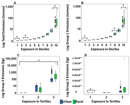 Distribution of inverse distance weighted (IDW) exposure in urban and rural Alberta. (A) Total sum of exposure from all emissions showed significantly higher medians in urban 1st and 3rd deciles and higher median in rural 10th decile. (B) Group 1 showed significantly higher median differences in urban 1st and 8th deciles and rural 10th decile. (C) Tertiles of Group 2 emissions with significantly higher median in urban 1st and 2nd tertiles and rural 3rd tertile. (D) Tertiles of Group 3 emissions with significantly higher median in urban 1st tertile (Mann Whitney U test, * p < 0.05).
