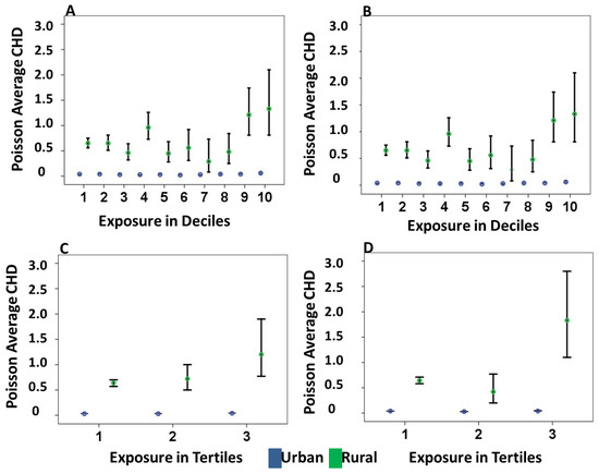 Distribution of the Poisson average of congenital heart defect (CHD) cases and 95% confidence intervals (CI) in urban and rural postal codes exposed to the percentile categories of inverse distance weighted (IDW) emissions. Rural postal codes had a larger average and variability of CHD cases per postal code in all the deciles for the sum of all emissions (A) and Group 1 emissions (B). The overall distributions in both Figure 2A,B were similar, and in urban postal codes, the average and variability were constant. For Group 2 (C) and Group 3 emissions (D), the average and variability of CHD cases by postal code was high in rural compared to urban postal codes, with the highest average in the 3rd tertile where the exposure was the highest.