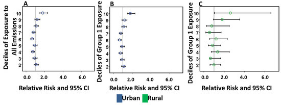 Adjusted relative risk of postal codes exposed to the sum of all and Group 1 only emissions in urban and rural regions. (A) Shows a significant increased risk ratio in the 10th decile with the highest exposure and inverse associations in the 4th and 6th deciles with modest exposure in urban postal codes. (B) Shows an increased risk ratio in the 10th decile with the highest exposure and inverse associations in the 4th, 6th and 7th deciles with modest exposure in urban postal codes. (C) Shows a significantly increased risk ratio in the 10th decile with the highest exposure in rural postal codes.
