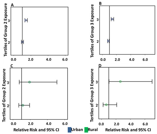 Adjusted relative risk of postal codes exposed to Group 2 and 3 emissions on CHD in urban and rural regions. (A,B) show increased risk ratio in the 3rd tertile with the highest exposure to Group 2 and 3 in urban postal codes. Group 3 also showed a significant inverse association in the 2nd tertile of exposure. (C) Shows the rural postal codes exposed to Group 2 emissions with no effect which may have been related to the small sample size. (D) Shows increased risk ratio (RR) of exposure to Group 3 in the 3rd tertile in rural postal codes.