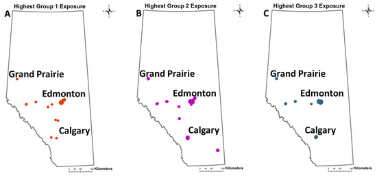 The postal codes for the individual three multipollutant groups showed similar distributions and were situated in the central, south, and western parts of Alberta, but mainly in the two largest cities of the province (Edmonton and Calgary).