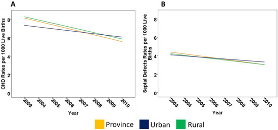 (A) Crude CHD rates in the province and rural regions show a significant decreasing trend, (* p = 0.005 and 0.003, respectively) not found in urban regions (p = 0.133); and (B) crude septal defects rates showed a significant downward trend in the province and rural regions (* p = 0.012 and 0.025, respectively), but not urban regions (p = 0.105).